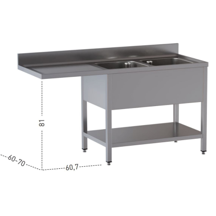 Lavatoio con due vasche, vano lavastoviglie a sinistra e ripiano – Profondità 70 cm