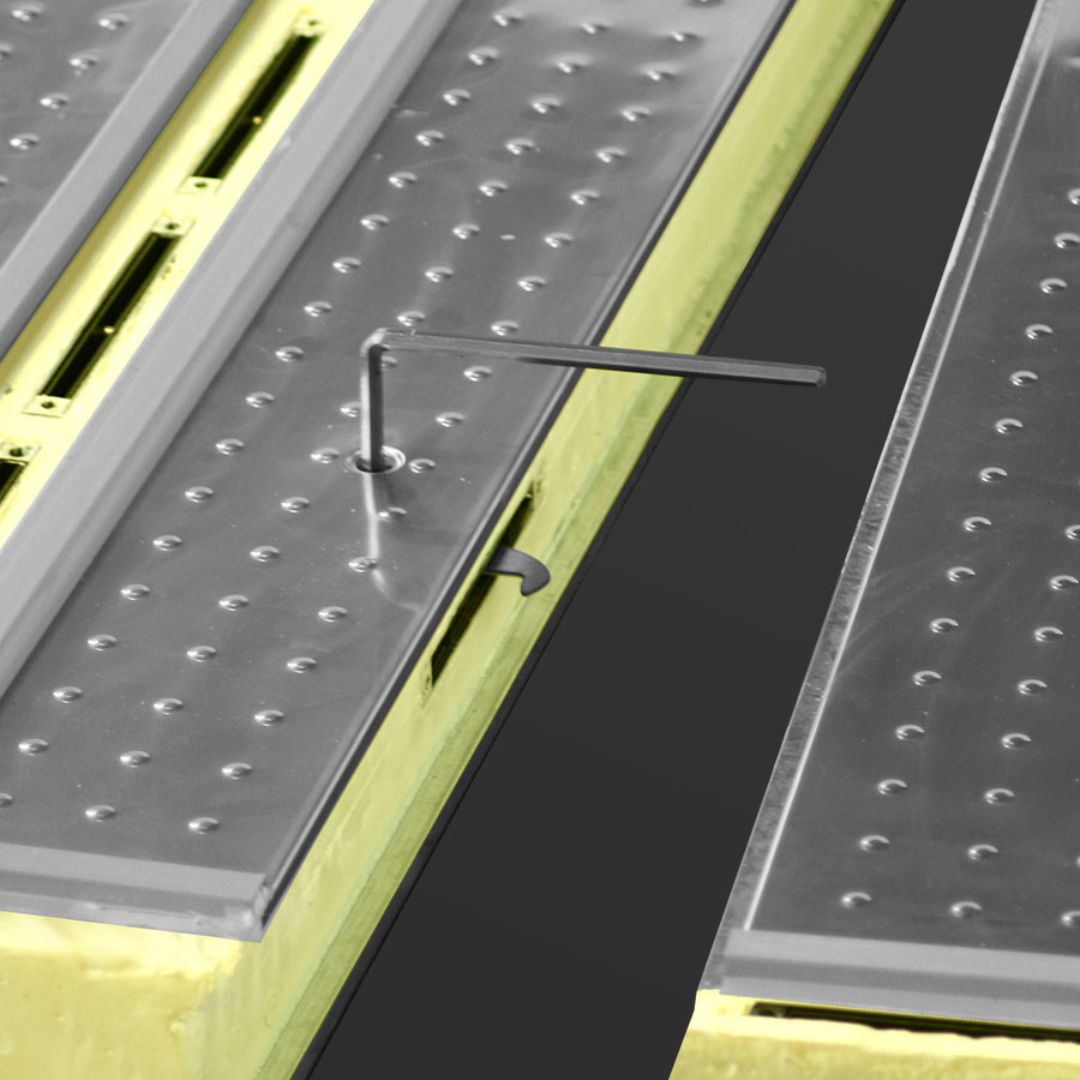 Disponibile versione Senza Pavimento ( con profilo a “U” per l’inserimento dei pannelli nel pavimento) oppure Con Pavimento (in lamiera di Acciaio Inox AISI 304 antisdrucciolo all’interno e lamiera di Acciaio Zincato all’eterno).