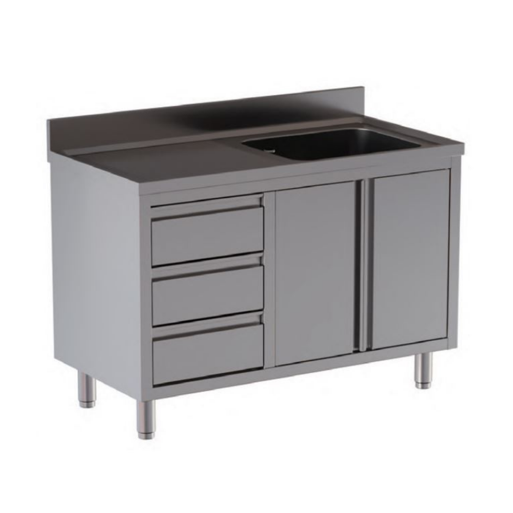 Lavatoio armadiato con una vasca, gocciolatoio a sinistra, due porte e tre cassetti a sinistra – Profondità 60 cm