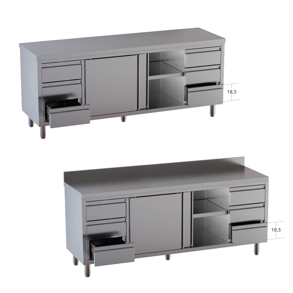 Home Mobili in Acciaio INOX Tavolo armadiato con porte scorrevoli, 3 cassetti a destra e 3 cassetti a sinistra Tavolo armadiato con porte scorrevoli – 3 cassetti a destra e 3 cassetti a sinistra – Profondità 70 cm