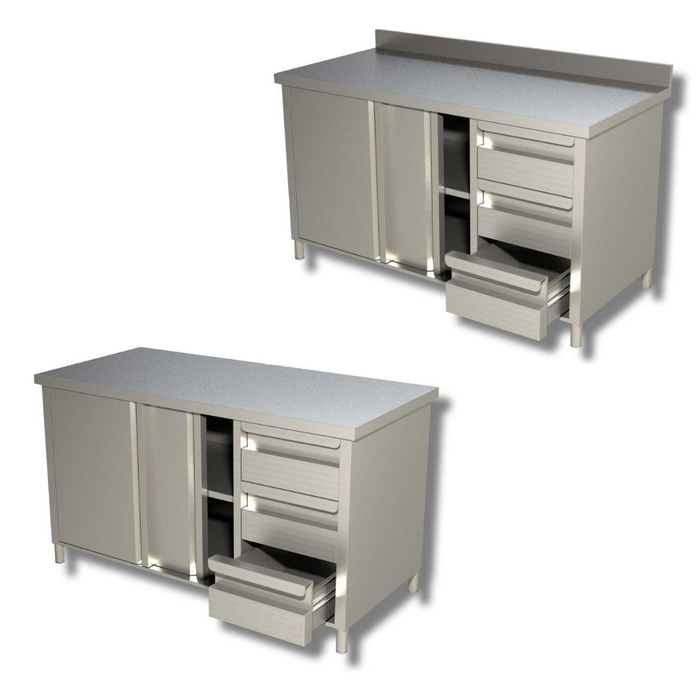 Tavolo armadiato con porte scorrevoli e 3 cassetti a destra – acciaio inox – Profondità 70 cm