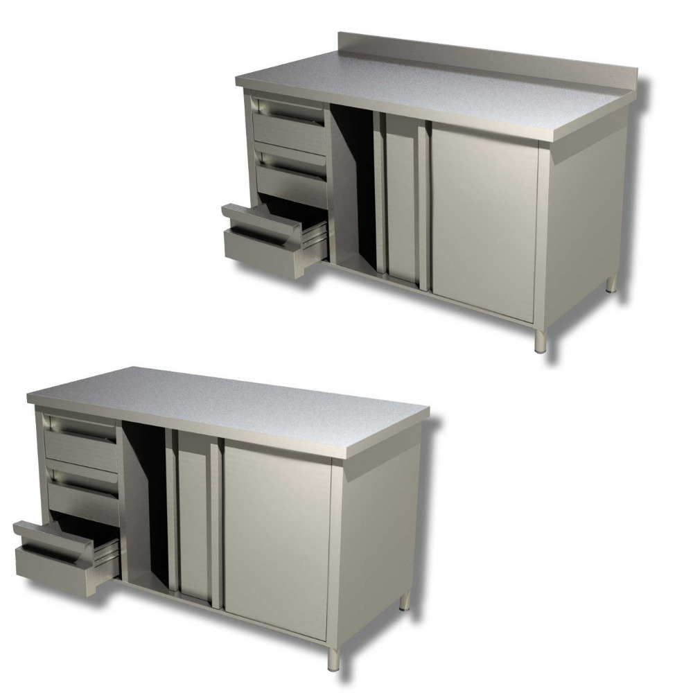 Tavolo armadiato con porte scorrevoli e 3 cassetti a sinistra – acciaio inox – Profondità 70 cm